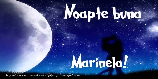 Această felicitare cu doi îndrăgostiți cu luna și stelele in fundal din colecția noastră de felicitari de noapte buna cu numele Marinela are o notă de originalitate și îți oferă ocazia să faci o persoană să se simtă specială datorită faptului că acolo este numele ei. Felicitarea se poate descărca gratuit sau se poate trimite prin Whatsapp, Facebook, Twitter, Pinterest. Imagine de noapte bună cu doi îndrăgostiți cu luna și stelele in fundal cu dimensiunile 600px x 300px și cu textul Noapte buna Marinela!.