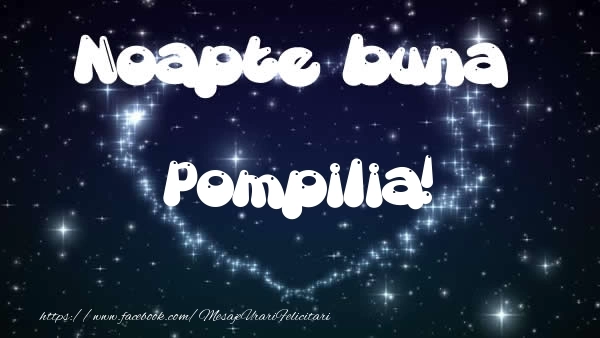 Această felicitare cu stele și o inimioară din colecția noastră de felicitari de noapte buna cu numele Pompilia are o notă de originalitate și îți oferă ocazia să faci o persoană să se simtă specială datorită faptului că acolo este numele ei. Felicitarea se poate descărca gratuit sau se poate trimite prin Whatsapp, Facebook, Twitter, Pinterest. Imagine de noapte bună cu stele și o inimioară cu dimensiunile 600px x 338px și cu textul Noapte buna Pompilia!.