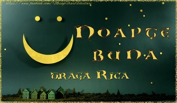 Această felicitare cu peisaj cu lună și stele care zâmbesc din colecția noastră de felicitari de noapte buna cu numele Rica are o notă de originalitate și îți oferă ocazia să faci o persoană să se simtă specială datorită faptului că acolo este numele ei. Felicitarea se poate descărca gratuit sau se poate trimite prin Whatsapp, Facebook, Twitter, Pinterest. Imagine de noapte bună cu peisaj cu lună și stele care zâmbesc cu dimensiunile 600px x 350px și cu textul Noapte buna Rica.