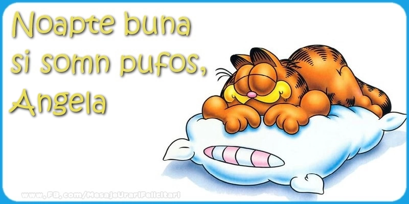 Această felicitare cu pisica care doarme din colecția noastră de felicitari de noapte buna cu numele Angela are o notă de originalitate și îți oferă ocazia să faci o persoană să se simtă specială datorită faptului că acolo este numele ei. Felicitarea se poate descărca gratuit sau se poate trimite prin Whatsapp, Facebook, Twitter, Pinterest. Imagine de noapte bună cu pisica care doarme cu dimensiunile 800px x 400px și cu textul Noapte buna si somn pufos,Angela.