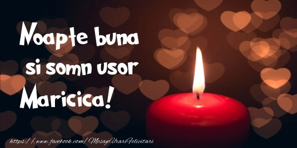 Această felicitare cu lumânare roșie aprinsă din colecția noastră de felicitari de noapte buna cu numele Maricica are o notă de originalitate și îți oferă ocazia să faci o persoană să se simtă specială datorită faptului că acolo este numele ei. Felicitarea se poate descărca gratuit sau se poate trimite prin Whatsapp, Facebook, Twitter, Pinterest. Imagine de noapte bună cu lumânare roșie aprinsă cu dimensiunile 600px x 300px și cu textul Noapte buna si Somn usor Maricica!.