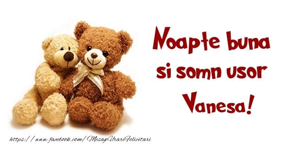 Această felicitare cu 2 ursuleți de pluș din colecția noastră de felicitari de noapte buna cu numele Vanesa are o notă de originalitate și îți oferă ocazia să faci o persoană să se simtă specială datorită faptului că acolo este numele ei. Felicitarea se poate descărca gratuit sau se poate trimite prin Whatsapp, Facebook, Twitter, Pinterest. Imagine de noapte bună cu 2 ursuleți de pluș cu dimensiunile 600px x 300px și cu textul Noapte buna si Somn usor Vanesa!.