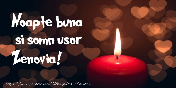 Această felicitare cu lumânare roșie aprinsă din colecția noastră de felicitari de noapte buna cu numele Zenovia are o notă de originalitate și îți oferă ocazia să faci o persoană să se simtă specială datorită faptului că acolo este numele ei. Felicitarea se poate descărca gratuit sau se poate trimite prin Whatsapp, Facebook, Twitter, Pinterest. Imagine de noapte bună cu lumânare roșie aprinsă cu dimensiunile 600px x 300px și cu textul Noapte buna si Somn usor Zenovia!.