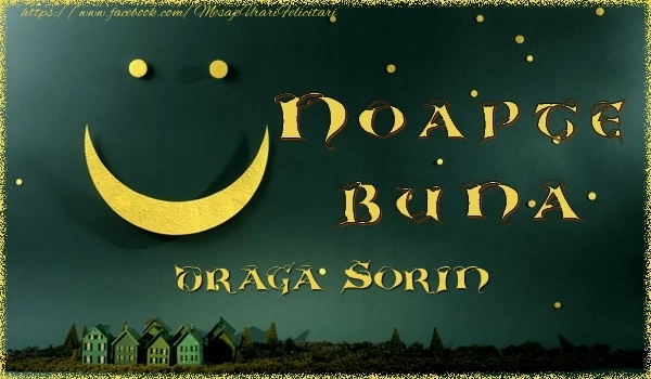 Această felicitare cu peisaj cu lună și stele care zâmbesc din colecția noastră de felicitari de noapte buna cu numele Sorin are o notă de originalitate și îți oferă ocazia să faci o persoană să se simtă specială datorită faptului că acolo este numele ei. Felicitarea se poate descărca gratuit sau se poate trimite prin Whatsapp, Facebook, Twitter, Pinterest. Imagine de noapte bună cu peisaj cu lună și stele care zâmbesc cu dimensiunile 600px x 350px și cu textul Noapte buna Sorin.