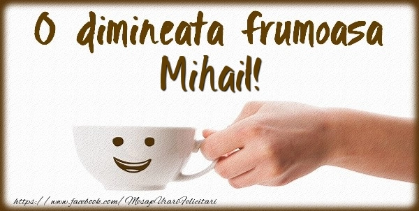 Această felicitare cu cafea oferită de o persoană din colecția noastră de felicitari de buna dimineata cu numele Mihail are o notă de originalitate și îți oferă ocazia să faci o persoană să se simtă specială datorită faptului că acolo este numele ei. Felicitarea se poate descărca gratuit sau se poate trimite prin Whatsapp, Facebook, Twitter, Pinterest. Imagine de bună dimineața cu cafea oferită de o persoană cu dimensiunile 600px x 302px și cu textul O dimineata frumoasa Mihail!.