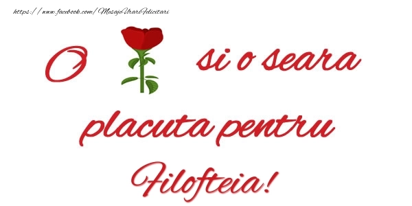 Această felicitare cu trandafir în dar din colecția noastră de felicitari de buna seara cu numele Filofteia are o notă de originalitate și îți oferă ocazia să faci o persoană să se simtă specială datorită faptului că acolo este numele ei. Felicitarea se poate descărca gratuit sau se poate trimite prin Whatsapp, Facebook, Twitter, Pinterest. Imagine de bună seara cu trandafir în dar cu dimensiunile 600px x 300px și cu textul O floare si o seara placuta pentru Filofteia!.