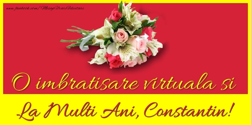 Felicitarea cu buchet de flori pe fundal roșu-galben este ca o explozie de bucurie și culoare, iar numele Constantin este adăugat cu gingășie pentru a personaliza această experiență de sărbătoare. Este modul tău de a spune la mulți ani într-un mod unic și special!