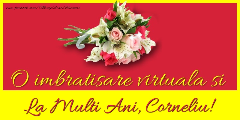 O imbratisare virtuala si la multi ani, Corneliu | Felicitare cu buchet de flori pe fundal roșu-galben | Felicitari de la multi ani