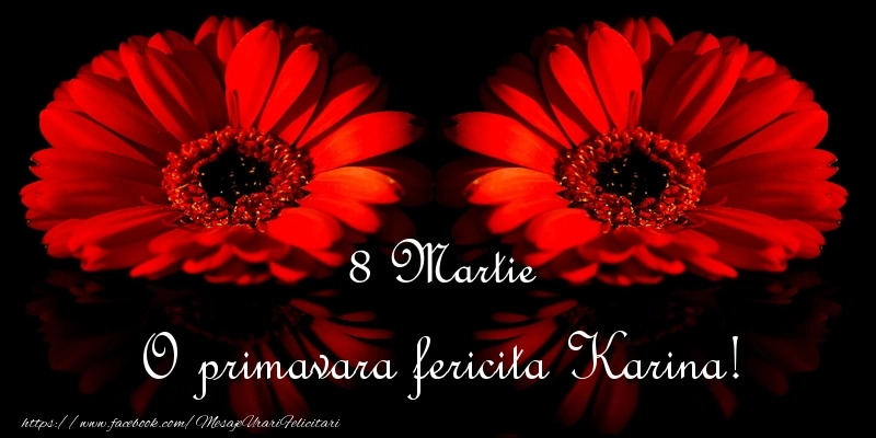 Oferiți mai mult decât un simplu cadou - oferiți o emoție personalizată de Ziua Femeii cu numele Karina! Felicitarea de 8 Martie cu 2 gherbera rosii pe fundal negru este menită să încânte și să emoționeze, sărbătorind feminitatea în toată splendoarea sa.