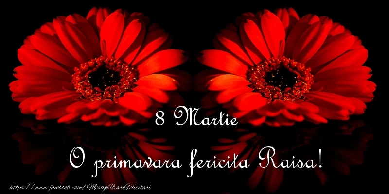 Oferiți mai mult decât un simplu cadou - oferiți o emoție personalizată de Ziua Femeii cu numele Raisa! Felicitarea de 8 Martie cu 2 gherbera rosii pe fundal negru este menită să încânte și să emoționeze, sărbătorind feminitatea în toată splendoarea sa.