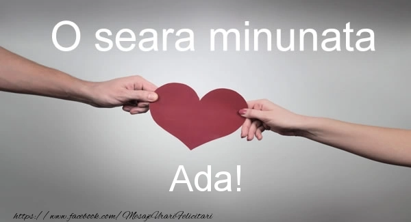 În această seară, liniștea aduce cu sine un sentiment de căldură special creat pentru Ada. Fiecare moment este un moment de bucurie, iar această felicitare cu o inimioară pe care o țin 2 persoane de bună seara pentru Ada aduce această atmosferă liniștitoare.