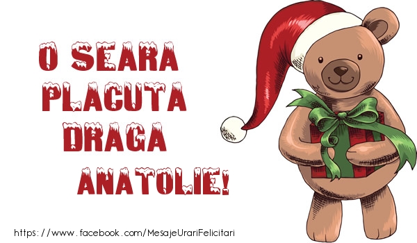 O seara placuta draga Anatolie! | Felicitare cu ursuleț cu șapca lui Mos Craciun și cu cadou în brațe | Felicitari de Craciun