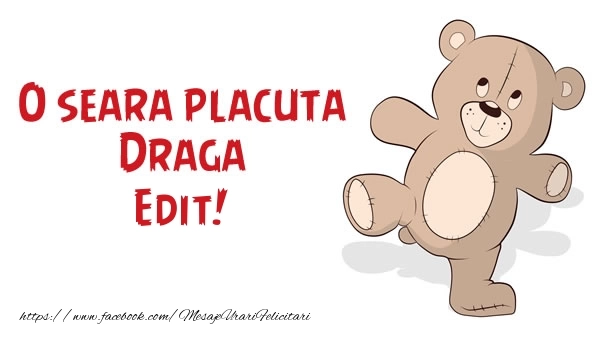 Această felicitare cu ursulețul vesel din colecția noastră de felicitari de buna seara cu numele Edit are o notă de originalitate și îți oferă ocazia să faci o persoană să se simtă specială datorită faptului că acolo este numele ei. Felicitarea se poate descărca gratuit sau se poate trimite prin Whatsapp, Facebook, Twitter, Pinterest. Imagine de bună seara cu ursulețul vesel cu dimensiunile 600px x 350px și cu textul O seara placuta Draga Edit!.