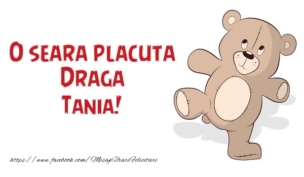 Această felicitare cu ursulețul vesel din colecția noastră de felicitari de buna seara cu numele Tania are o notă de originalitate și îți oferă ocazia să faci o persoană să se simtă specială datorită faptului că acolo este numele ei. Felicitarea se poate descărca gratuit sau se poate trimite prin Whatsapp, Facebook, Twitter, Pinterest. Imagine de bună seara cu ursulețul vesel cu dimensiunile 600px x 350px și cu textul O seara placuta Draga Tania!.