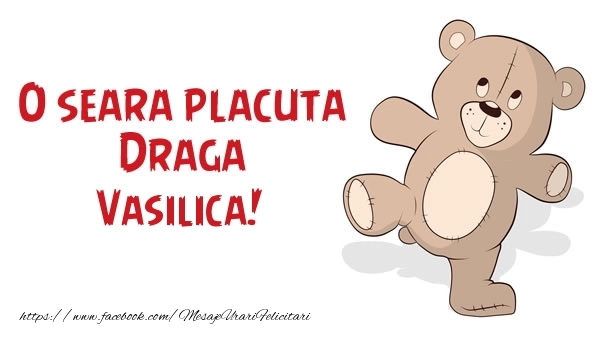 Această felicitare cu ursulețul vesel din colecția noastră de felicitari de buna seara cu numele Vasilica are o notă de originalitate și îți oferă ocazia să faci o persoană să se simtă specială datorită faptului că acolo este numele ei. Felicitarea se poate descărca gratuit sau se poate trimite prin Whatsapp, Facebook, Twitter, Pinterest. Imagine de bună seara cu ursulețul vesel cu dimensiunile 600px x 350px și cu textul O seara placuta Draga Vasilica!.