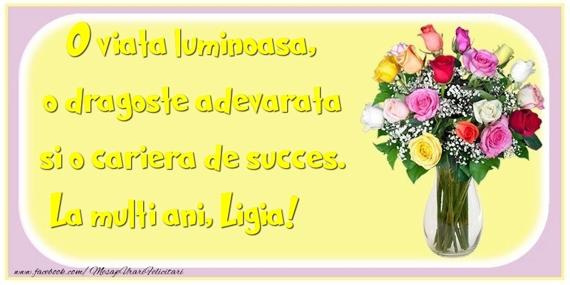 Felicitarea cu vază cu trandafiri de multe culori este ca o explozie de bucurie și culoare, iar numele Ligia este adăugat cu gingășie pentru a personaliza această experiență de sărbătoare. Este modul tău de a spune la mulți ani într-un mod unic și special!
