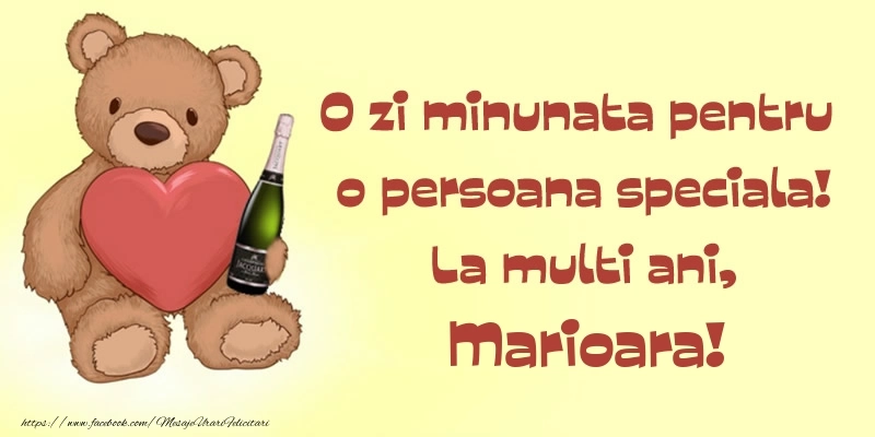 Această felicitare cu ursuleț cu inimioară și șampanie din colecția noastră de felicitari de ziua numelui cu numele Marioara are o notă de originalitate și îți oferă ocazia să faci o persoană să se simtă specială datorită faptului că acolo este numele ei. Felicitarea se poate descărca gratuit sau se poate trimite prin Whatsapp, Facebook, Twitter, Pinterest. Imagine de ziua onomastică cu ursuleț cu inimioară și șampanie cu dimensiunile 800px x 400px și cu textul O zi minunata pentru o persoana speciala! La multi ani, Marioara!.