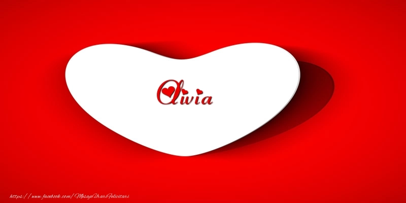 Această felicitare cu inimioară pe fundal roșu aprins din colecția noastră de felicitari de dragoste cu numele Olivia are o notă de originalitate și îți oferă ocazia să faci o persoană să se simtă specială datorită faptului că acolo este numele ei. Felicitarea se poate descărca gratuit sau se poate trimite prin Whatsapp, Facebook, Twitter, Pinterest. Imagine de iubire cu inimioară pe fundal roșu aprins cu dimensiunile 800px x 400px și cu textul Olivia inima.