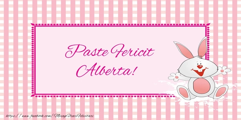 Felicitarea pentru Alberta cu iepuraș de paste pe fundal in carouri este un cadou unic și personal, creat special pentru Paște. Numele Alberta devine inima acestui dar, aducând bucurie și căldură într-un mod special și intim.