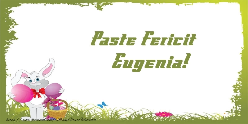 Felicitarea pentru Eugenia cu iepuras simpatic cu oua pe fundal alb si chenar verde este un cadou unic și personal, creat special pentru Paște. Numele Eugenia devine inima acestui dar, aducând bucurie și căldură într-un mod special și intim.