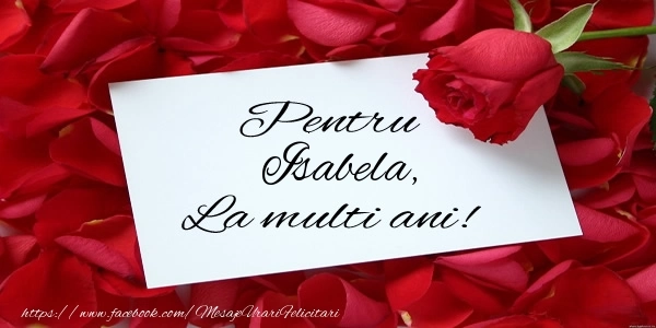 Celebrează ziua specială a unei persoane dragi cu numele Isabela cu această felicitare cu trandafir roșu pe fundal cu petale de trandafir plină de eleganță și rafinament. Petalele completează frumusețea trandafirului, aducând un strop de rafinament și delicatețe în cadru. Fiecare petală reprezintă un gând bun și o urare de fericire și împlinire pentru destinatara acestei felicitări. Felicitarea se poate descărca gratuit sau se poate trimite prin Whatsapp, Facebook, Twitter, Pinterest. Imaginea are dimensiunile 600px x 300px și textul Pentru Isabela, La multi ani!.