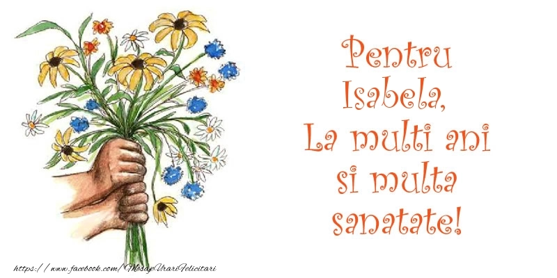 Felicitarea cu buchet de flori oferit de o persoană este ca o explozie de bucurie și culoare, iar numele Isabela este adăugat cu gingășie pentru a personaliza această experiență de sărbătoare. Este modul tău de a spune la mulți ani într-un mod unic și special!