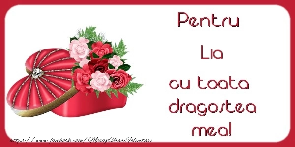 Această felicitare cu flori și inimioare din colecția noastră de felicitari de Dragobete cu numele Lia are o notă de originalitate și îți oferă ocazia să faci o persoană să se simtă specială datorită faptului că acolo este numele ei. Felicitarea se poate descărca gratuit sau se poate trimite prin Whatsapp, Facebook, Twitter, Pinterest. Imagine de dragobete cu flori și inimioare cu dimensiunile 600px x 300px și cu textul Pentru Lia cu toata dragostea mea!.