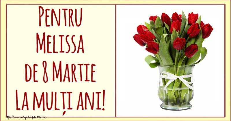 Oferiți mai mult decât un simplu cadou - oferiți o emoție personalizată de Ziua Femeii cu numele Melissa! Felicitarea de 8 Martie cu buchet de lalele rosii in vaza este menită să încânte și să emoționeze, sărbătorind feminitatea în toată splendoarea sa.