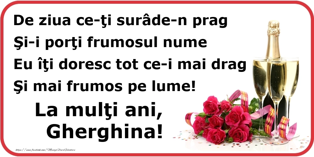Poezie de ziua numelui: De ziua ce-ţi surâde-n prag / Şi-i porţi frumosul nume / Eu îţi doresc tot ce-i mai drag / Şi mai frumos pe lume! La mulţi ani, Gherghina!