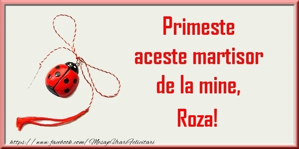 Această felicitare cu mărtișor cu buburuză din colecția noastră de felicitari de Martisor cu numele Roza are o notă de originalitate și îți oferă ocazia să faci o persoană să se simtă specială datorită faptului că acolo este numele ei. Felicitarea se poate descărca gratuit sau se poate trimite prin Whatsapp, Facebook, Twitter, Pinterest. Imagine de 1 Martie cu mărtișor cu buburuză cu dimensiunile 600px x 300px și cu textul Primeste aceste martisor de la mine, Roza.