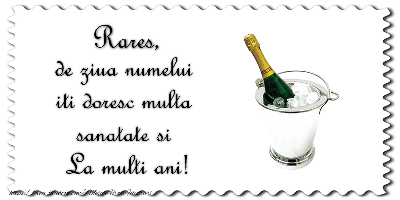Această felicitare cu sampanie în frapiera pentru femei sau bărbați din colecția noastră de felicitari de ziua numelui cu numele Rares are o notă de originalitate și îți oferă ocazia să faci o persoană să se simtă specială datorită faptului că acolo este numele ei. Felicitarea se poate descărca gratuit sau se poate trimite prin Whatsapp, Facebook, Twitter, Pinterest. Imagine de ziua onomastică cu sampanie în frapiera pentru femei sau bărbați cu dimensiunile 800px x 400px și cu textul Rares de ziua numelui iti doresc multa sanatate si La multi ani!.