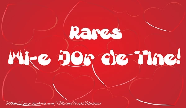 Această felicitare cu fundal cu inimioare din colecția noastră de felicitari de dragoste cu numele Rares are o notă de originalitate și îți oferă ocazia să faci o persoană să se simtă specială datorită faptului că acolo este numele ei. Felicitarea se poate descărca gratuit sau se poate trimite prin Whatsapp, Facebook, Twitter, Pinterest. Imagine de iubire cu fundal cu inimioare cu dimensiunile 600px x 350px și cu textul Rares mi-e dor de tine!.