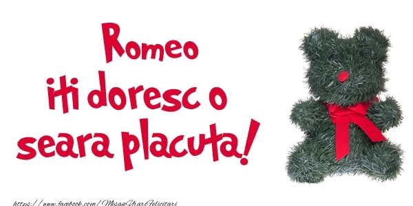 Această felicitare cu ursuleț de pluș din colecția noastră de felicitari de buna seara cu numele Romeo are o notă de originalitate și îți oferă ocazia să faci o persoană să se simtă specială datorită faptului că acolo este numele ei. Felicitarea se poate descărca gratuit sau se poate trimite prin Whatsapp, Facebook, Twitter, Pinterest. Imagine de bună seara cu ursuleț de pluș cu dimensiunile 600px x 300px și cu textul Romeo iti doresc o seara placuta!.