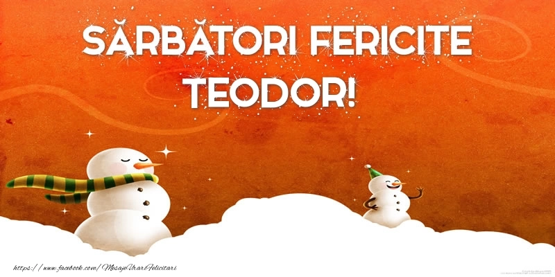 Această felicitare cu oameni de zăpadă din colecția noastră de felicitari de Craciun cu numele Teodor are o notă de originalitate și îți oferă ocazia să faci o persoană să se simtă specială datorită faptului că acolo este numele ei. Felicitarea se poate descărca gratuit sau se poate trimite prin Whatsapp, Facebook, Twitter, Pinterest. Imagine de Sărbătoarea Crăciunului cu oameni de zăpadă cu dimensiunile 800px x 400px și cu textul Sărbători Fericite Teodor!.