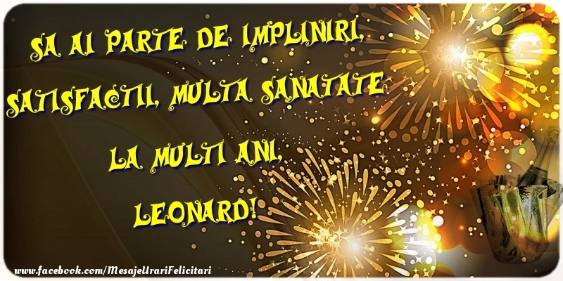 Sa ai parte de impliniri, satisfactii, multa sanatate La multi ani, Leonard | Felicitare cu șampanie și artificii | Felicitari de zi de nastere