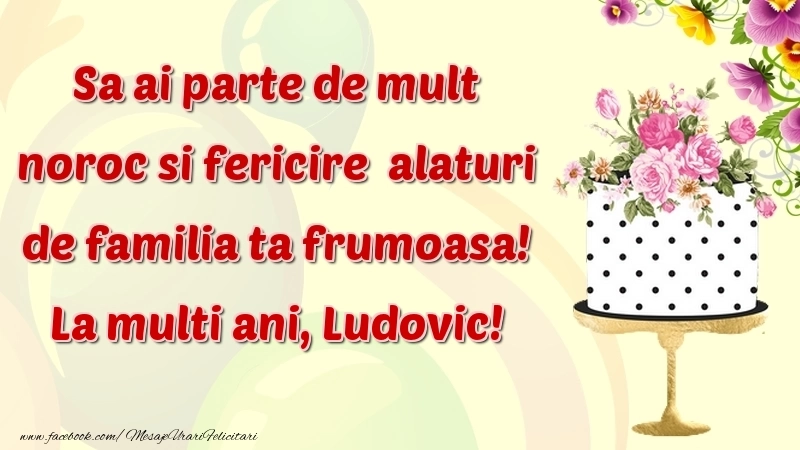 Această felicitare cu flori și desen cu tort din colecția noastră de felicitari de zi de nastere cu numele Ludovic are o notă de originalitate și îți oferă ocazia să faci o persoană să se simtă specială datorită faptului că acolo este numele ei. Felicitarea se poate descărca gratuit sau se poate trimite prin Whatsapp, Facebook, Twitter, Pinterest. Imagine de zi de nastere cu flori și desen cu tort cu dimensiunile 800px x 450px și cu textul Sa ai parte de mult noroc si fericire alaturi de familia ta frumoasa! Ludovic.