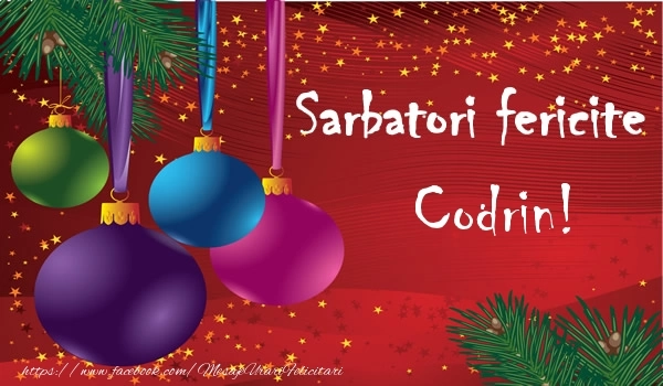 Felicitarea cu globuri colorate pe fundal roșu cu steluțe pentru Codrin spune o poveste de iarnă unică, iar numele Codrin este eroul principal. Este o călătorie captivantă în lumea minunată a Crăciunului, personalizată pentru a aduce bucurie și emoție.