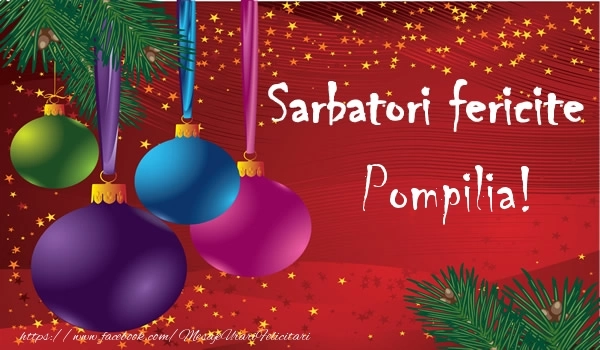 Sarbatori fericite Pompilia! | Felicitare cu globuri colorate pe fundal roșu cu steluțe | Felicitari de Craciun