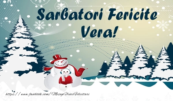 Această felicitare cu peisaj de iarnă cu brazi și om de zapada din colecția noastră de felicitari de Craciun cu numele Vera are o notă de originalitate și îți oferă ocazia să faci o persoană să se simtă specială datorită faptului că acolo este numele ei. Felicitarea se poate descărca gratuit sau se poate trimite prin Whatsapp, Facebook, Twitter, Pinterest. Imagine de Sărbătoarea Crăciunului cu peisaj de iarnă cu brazi și om de zapada cu dimensiunile 600px x 350px și cu textul Sarbatori fericite Vera! .