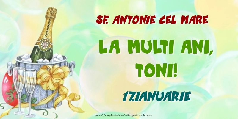 Sf. Antonie cel Mare La multi ani, Toni! 17.Ianuarie | Felicitare cu șampanie la gheața pe fundal cu baloane | Felicitari de Ziua Numelui