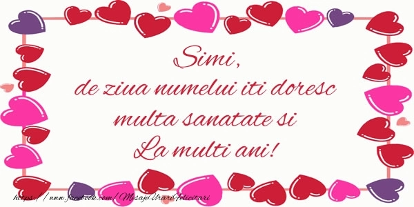 Felicitarea cu chenar de dragoste din inimioare de Ziua Numelui este un cadou gândit special pentru sărbătoare numelui Simi. Numele Simi devine piesa centrală a acestui dar unic, aducând sărbătoriților un strop de bucurie în aceată zi specială.