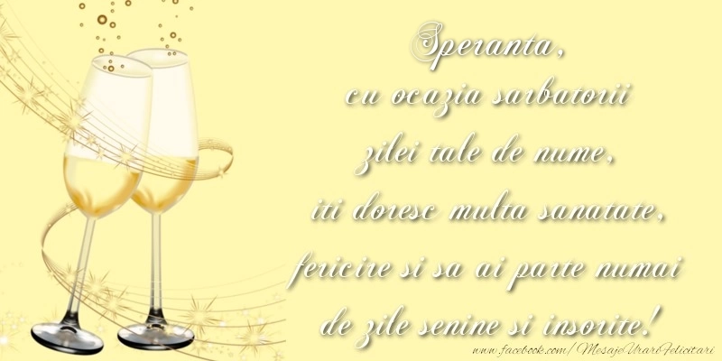 Speranta cu ocazia sarbatorii zilei tale de nume, iti doresc multa sanatate, fericire si sa ai parte numai de zile senine si insorite!