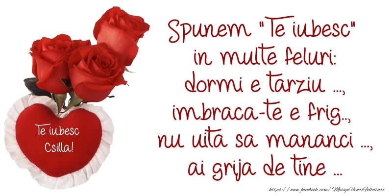 Spunem Te iubesc in multe feluri: dormi e tarziu ..., imbraca-te e frig.., nu uita sa mananci ..., ai grija de tine ... Te Iubesc Csilla!