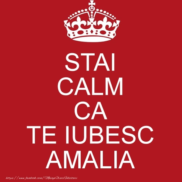 Această felicitare cu un mesaj KEEP CALM - STAI CALM din colecția noastră de felicitari de dragoste cu numele Amalia are o notă de originalitate și îți oferă ocazia să faci o persoană să se simtă specială datorită faptului că acolo este numele ei. Felicitarea se poate descărca gratuit sau se poate trimite prin Whatsapp, Facebook, Twitter, Pinterest. Imagine de iubire cu un mesaj KEEP CALM - STAI CALM cu dimensiunile 600px x 600px și cu textul STAI CALM CA TE IUBESC Amalia!.