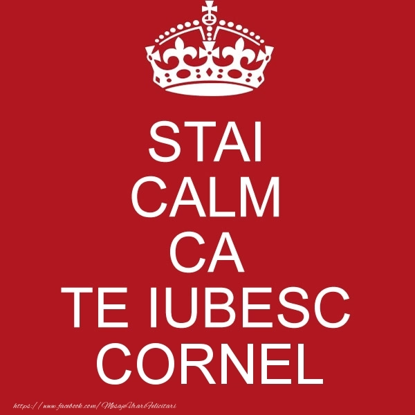 Această felicitare cu un mesaj KEEP CALM - STAI CALM din colecția noastră de felicitari de dragoste cu numele Cornel are o notă de originalitate și îți oferă ocazia să faci o persoană să se simtă specială datorită faptului că acolo este numele ei. Felicitarea se poate descărca gratuit sau se poate trimite prin Whatsapp, Facebook, Twitter, Pinterest. Imagine de iubire cu un mesaj KEEP CALM - STAI CALM cu dimensiunile 600px x 600px și cu textul STAI CALM CA TE IUBESC Cornel!.