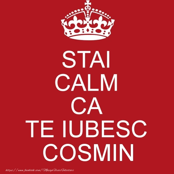 Această felicitare cu un mesaj KEEP CALM - STAI CALM din colecția noastră de felicitari de dragoste cu numele Cosmin are o notă de originalitate și îți oferă ocazia să faci o persoană să se simtă specială datorită faptului că acolo este numele ei. Felicitarea se poate descărca gratuit sau se poate trimite prin Whatsapp, Facebook, Twitter, Pinterest. Imagine de iubire cu un mesaj KEEP CALM - STAI CALM cu dimensiunile 600px x 600px și cu textul STAI CALM CA TE IUBESC Cosmin!.