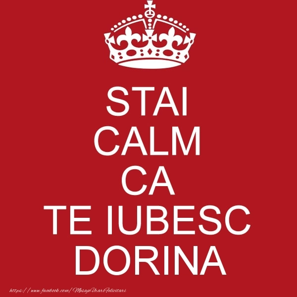 Această felicitare cu un mesaj KEEP CALM - STAI CALM din colecția noastră de felicitari de dragoste cu numele Dorina are o notă de originalitate și îți oferă ocazia să faci o persoană să se simtă specială datorită faptului că acolo este numele ei. Felicitarea se poate descărca gratuit sau se poate trimite prin Whatsapp, Facebook, Twitter, Pinterest. Imagine de iubire cu un mesaj KEEP CALM - STAI CALM cu dimensiunile 600px x 600px și cu textul STAI CALM CA TE IUBESC Dorina!.