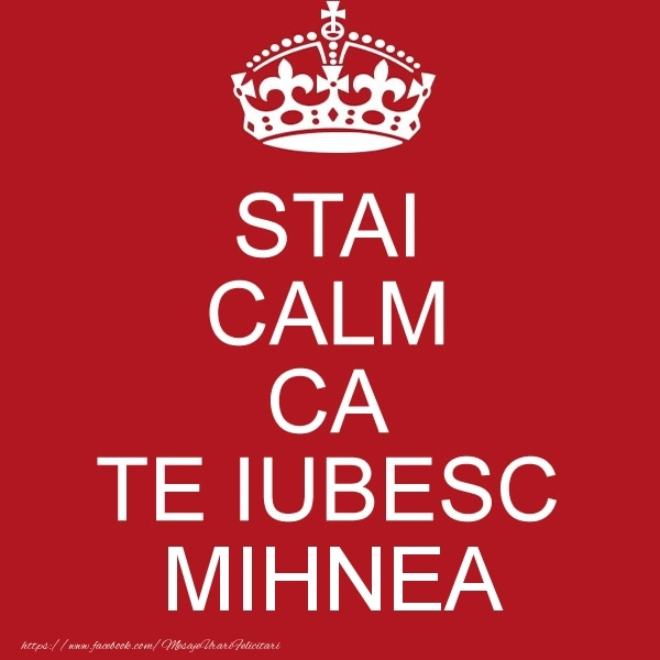Această felicitare cu un mesaj KEEP CALM - STAI CALM din colecția noastră de felicitari de dragoste cu numele Mihnea are o notă de originalitate și îți oferă ocazia să faci o persoană să se simtă specială datorită faptului că acolo este numele ei. Felicitarea se poate descărca gratuit sau se poate trimite prin Whatsapp, Facebook, Twitter, Pinterest. Imagine de iubire cu un mesaj KEEP CALM - STAI CALM cu dimensiunile 600px x 600px și cu textul STAI CALM CA TE IUBESC Mihnea!.