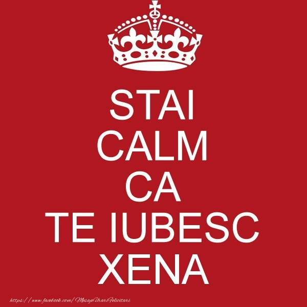 Această felicitare cu un mesaj KEEP CALM - STAI CALM din colecția noastră de felicitari de dragoste cu numele Xena are o notă de originalitate și îți oferă ocazia să faci o persoană să se simtă specială datorită faptului că acolo este numele ei. Felicitarea se poate descărca gratuit sau se poate trimite prin Whatsapp, Facebook, Twitter, Pinterest. Imagine de iubire cu un mesaj KEEP CALM - STAI CALM cu dimensiunile 600px x 600px și cu textul STAI CALM CA TE IUBESC Xena!.