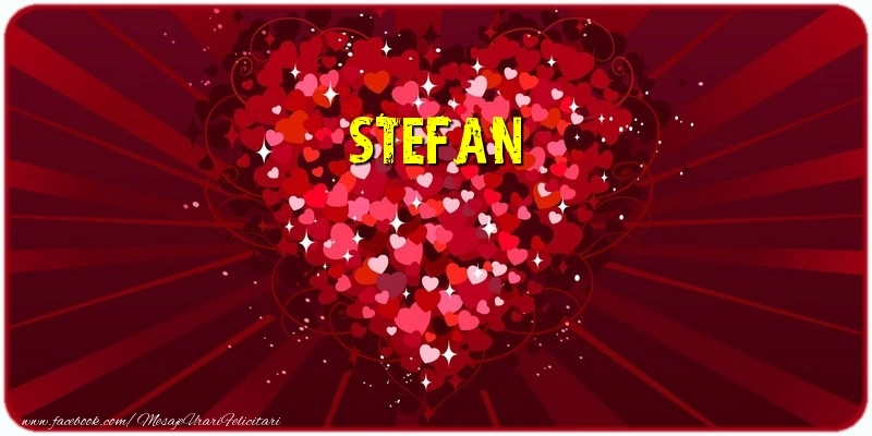 Această felicitare cu inimă facută din mai multe inimioare din colecția noastră de felicitari de dragoste cu numele Stefan are o notă de originalitate și îți oferă ocazia să faci o persoană să se simtă specială datorită faptului că acolo este numele ei. Felicitarea se poate descărca gratuit sau se poate trimite prin Whatsapp, Facebook, Twitter, Pinterest. Imagine de iubire cu inimă facută din mai multe inimioare cu dimensiunile 800px x 400px și cu textul Stefan.
